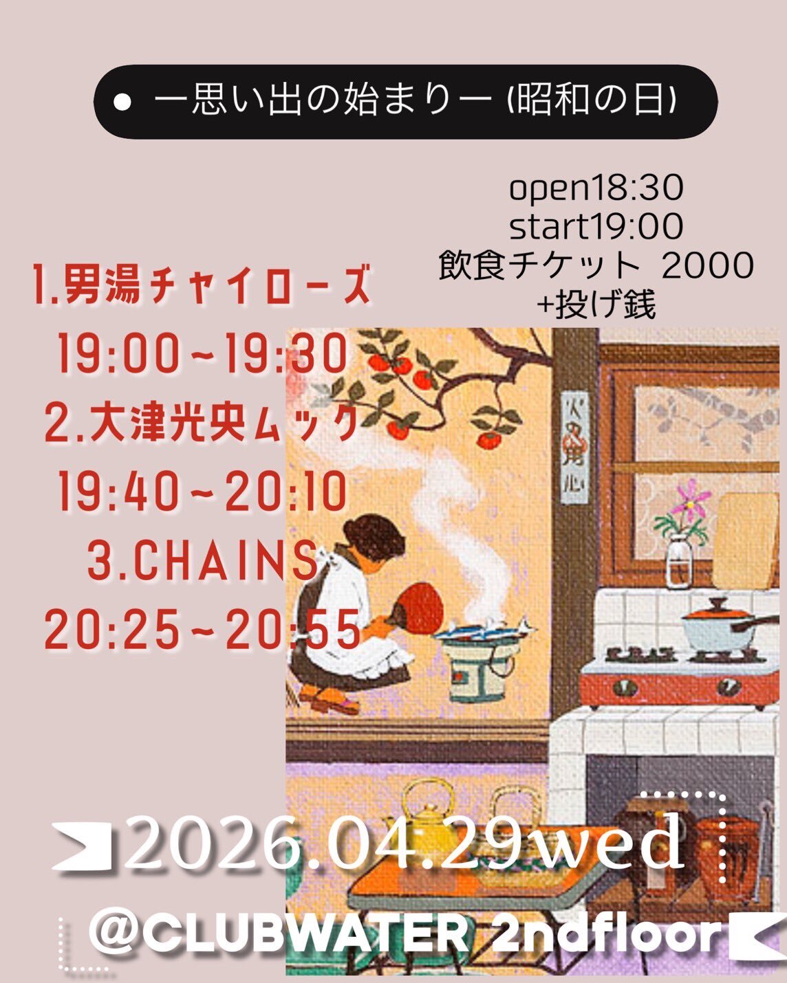 1.男湯チャイローズ 19:00〜19:30 2.大津光央ムック 19:40〜20:10 3.CHAINS 20:25〜20:55