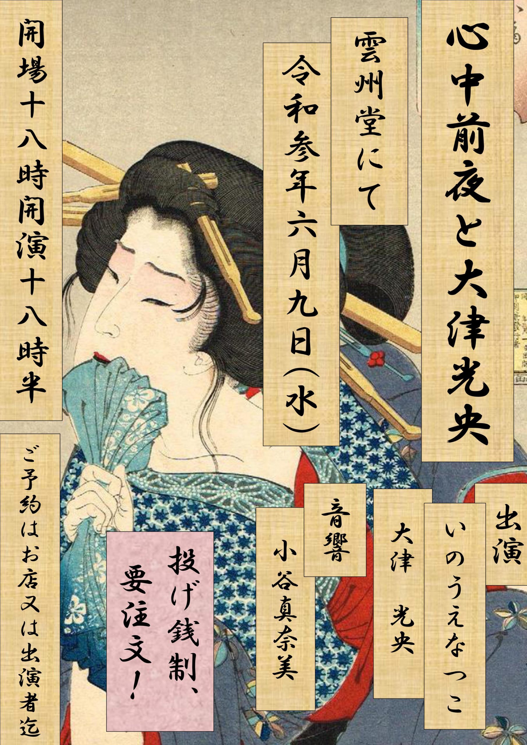 ※IORIダイニング休業のため、当日はドリンクの提供のみ。フードの持込は可。 ご予約、お問い合わせはお店又は出演者迄。